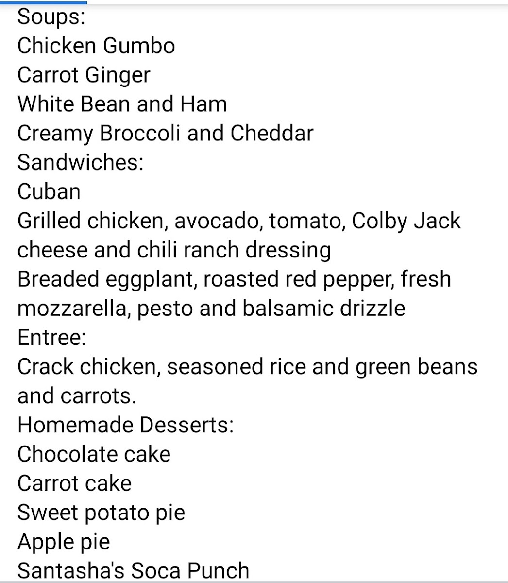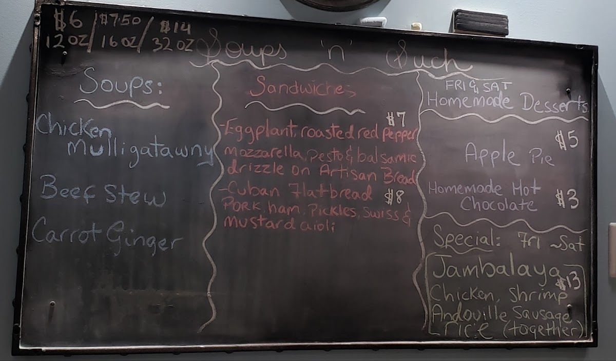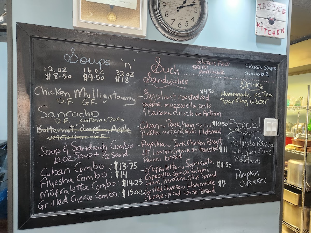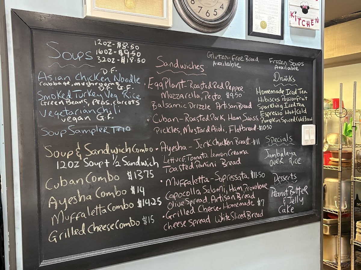 The menu at Soups 'n' Such offers a diverse range of comforting options to suit all tastes. Sandwich lovers can indulge in hearty choices like the Eggplant Panini, Cuban Flatbread, Grilled Cheese Ayesha Sandwich, and Muffaletta Sandwich, each offering a unique flavor combination. For a complete meal, the Cuban Combo, Grilled Cheese Combo, and Muffaletta Combo provide satisfying pairings. For those seeking lighter fare or a refreshing drink, the restaurant offers options like Soda, Water, Arizona Ice Tea, and Sparkling Water, as well as a Sparkling Iced Tea. The menu also accommodates dietary preferences with options such as Gluten Free Bread. The specials include the flavorful Pollo La Brasa, and the soup selection stands out with favorites like Chicken Cheddar & Potato Chowder, Beef Chili, Vegetable Coconut Curry, and the delightful Soup Sampler Trio. To finish off your meal, try the Coconut Pineapple Cake, a sweet treat to satisfy any craving. Whether you're in the mood for a light snack or a filling meal, Soups 'n' Such offers something for everyone.